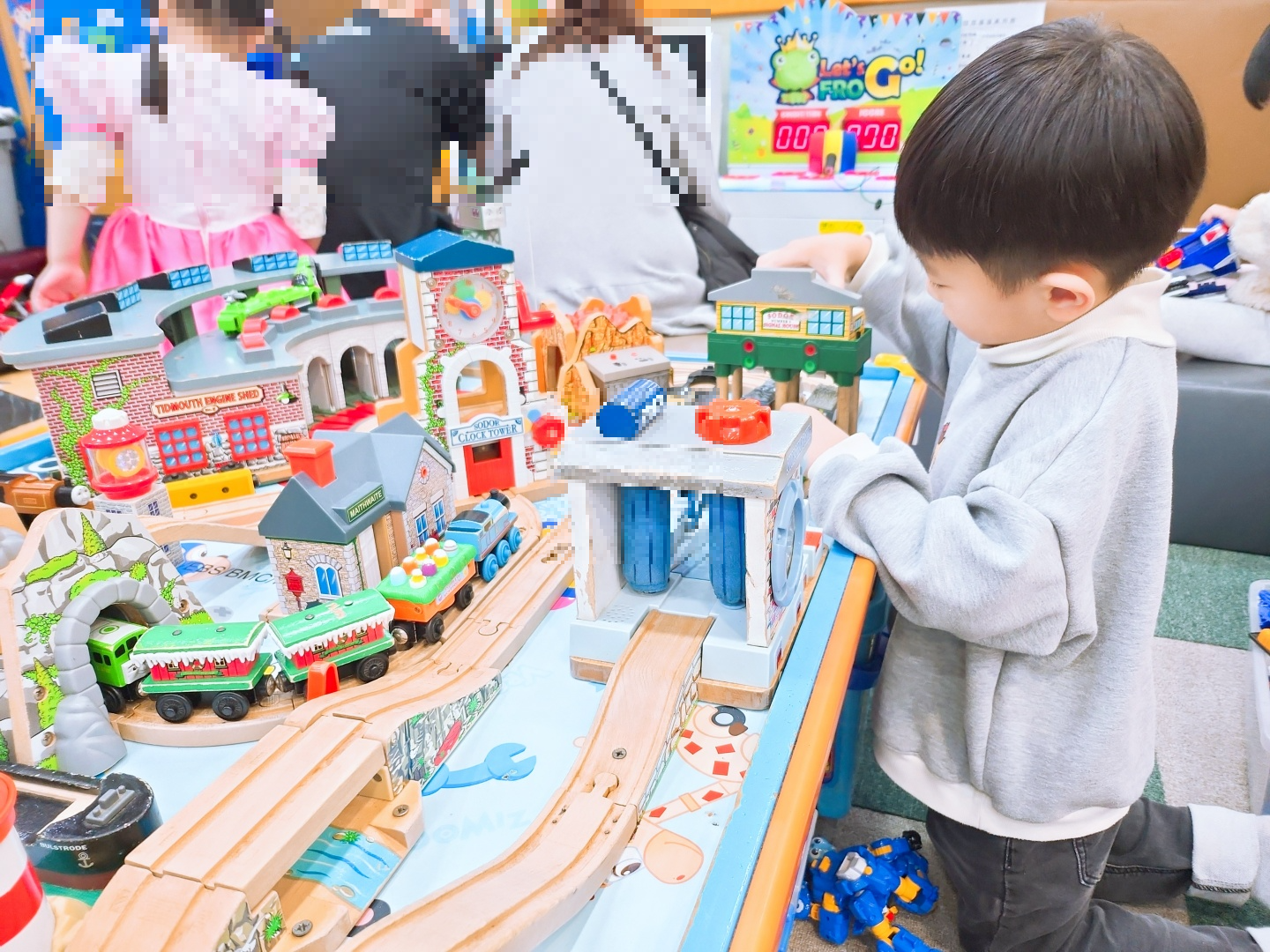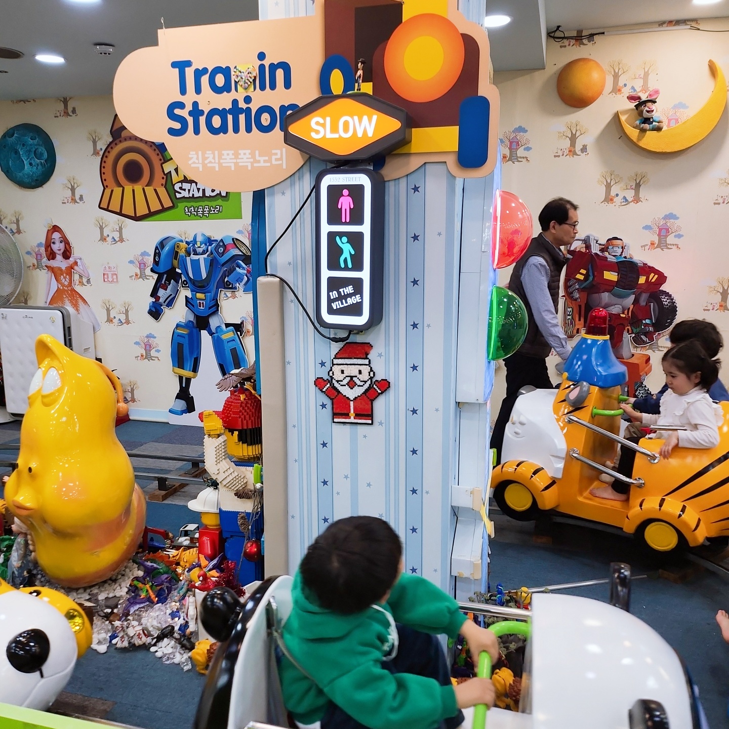 기차타면서 하이파이브도 하고 가운데 전시되어 있는 다양한 장난감들도 구경하기 좋아요.